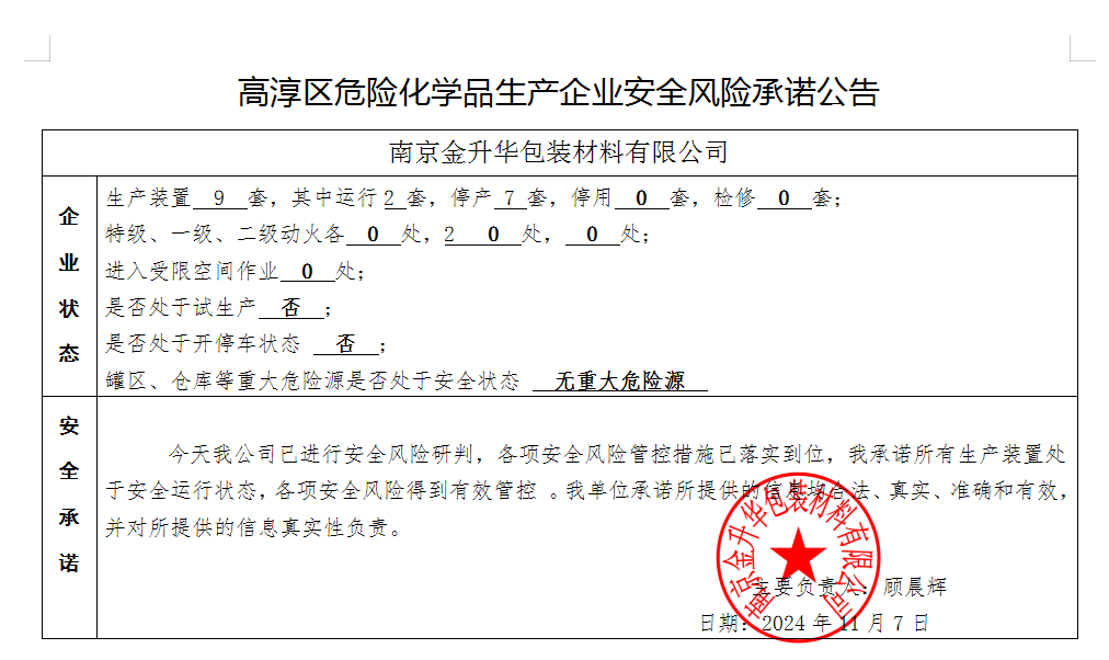 | 信息名稱: | 高淳區危險化學品生產企業安全風險承諾公告 |