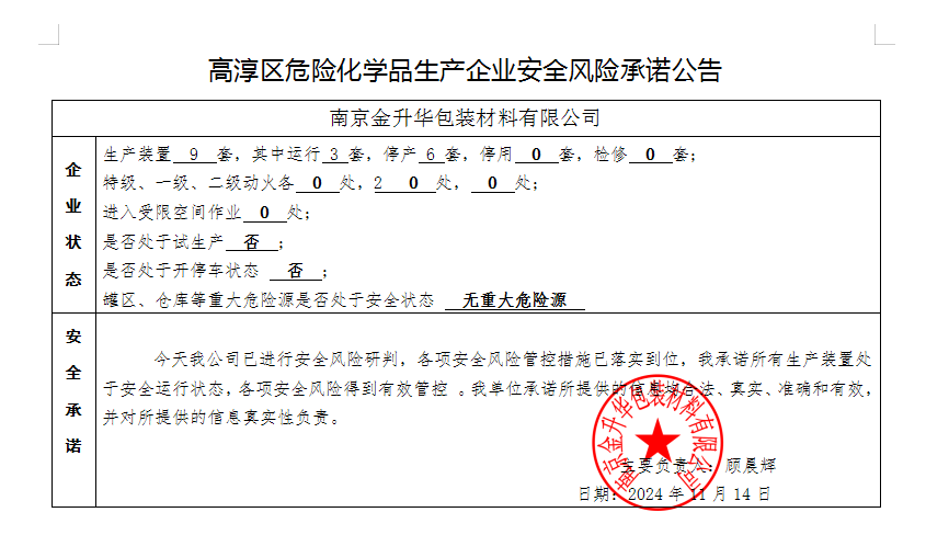 | 信息名稱: | 高淳區危險化學品生產企業安全風險承諾公告 |