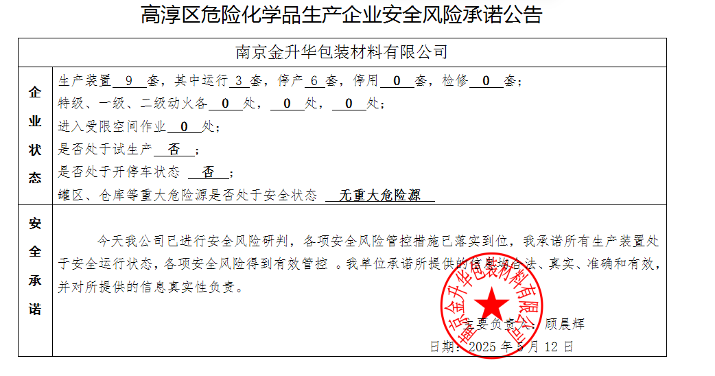 | 信息名稱: | 高淳區危險化學品生產企業安全風險承諾公告 |