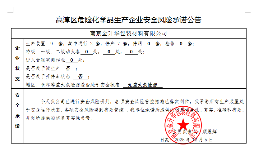 | 信息名稱: | 高淳區危險化學品生產企業安全風險承諾公告 |