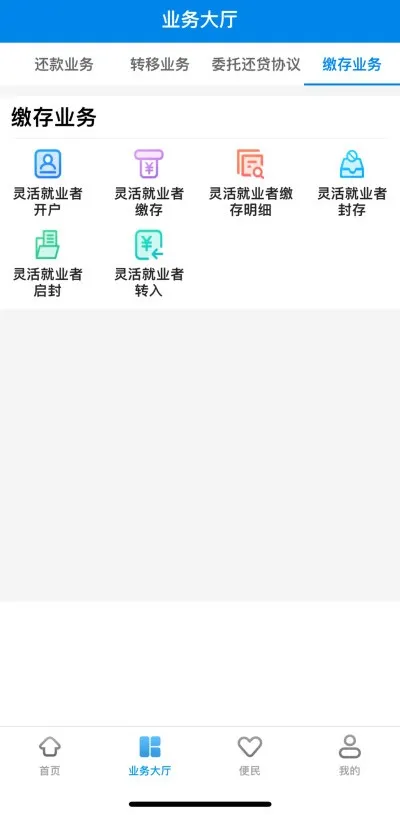 1、點(diǎn)擊【業(yè)務(wù)大廳】>【繳存業(yè)務(wù)】>【靈活就業(yè)者繳存】后進(jìn)入如下自助辦理業(yè)務(wù)頁面。
